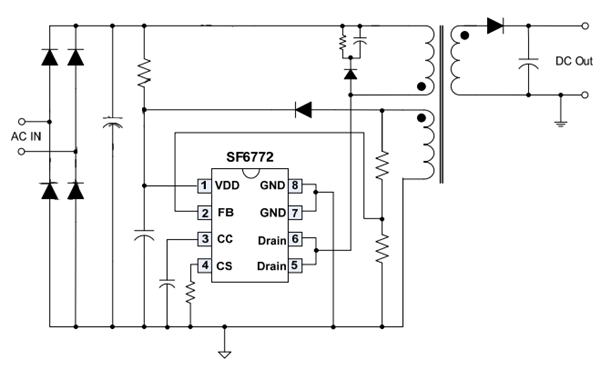 SF6772是準(zhǔn)諧振(QR)模式的高精度原邊反饋控制(PSR)恒壓恒流(CV/CC)控制器。該系列驅(qū)動(dòng)外部功率MOS管,非常適合低成本小功率充電器、適配器、和       LED照明場(chǎng)合。