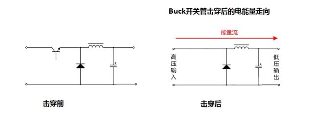 對(duì)于Buck電路而言,若開關(guān)管擊穿短路,由于沒(méi)隔離,輸入端較高的電壓,直接通過(guò)電感作用在負(fù)載端,負(fù)載會(huì)因?yàn)檫^(guò)壓燒毀。