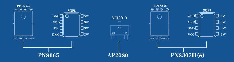 6、全系列腳位兼容:PN816x/PN8307x全系列芯片腳位相同,SOP8/PDFN兩種封裝靈活選擇,便于電源產品系列化設計及安規認證。