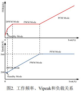 在重載條件,芯片工作在PFM模式,Ipeak不變,工作頻率隨輸出電流減小而減小;當頻率減小到25kHz左右,芯片進入PWM模式,頻率調制變得非常緩慢,Ipeak隨輸出電流減小而減小,該模式可以避免音頻噪音,同時有利于提升25%帶載效率;當芯 片 Ipeak 調制到 200mA ,芯片進入空載模式(Standby模式),Ipeak不變,工作頻率隨輸出電流減小而減小,波形如圖2所示。