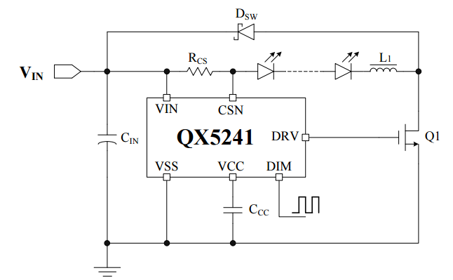 QX5241是通過外接一個電阻設定輸出電流,最大可達3A,通過DIM引腳實現輝度控制功能。并采用泉芯特有的專利結構,在寬輸入電壓范圍下,保證電流檢測達到±5%的電流精度,由于采用滯環控制方式,QX5241對負載瞬變具有非常快的響應速度,對輸入電壓具有高的抑制比,最高工作頻率可到2MHz,工作溫度范圍從-40℃到125℃.