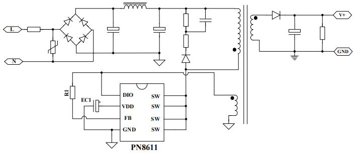 PN8611為原邊反饋工作模式,可省略光耦和TL431。內置高壓啟動電路,可實現芯片空載損耗(230VAC)小于50mW。在恒壓模式,采用多模式技術提高效率并消除音頻噪聲,使得系統滿足6級能效標準,內置輸出線補償功能使系統獲得較好的負載調整率。