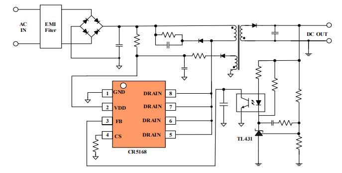 CR5168采用SOP-8L 的封裝,提供 VDD 電壓從 8.5V 至 36.5V 更寬的工作范圍,是一款高集成度、低待機(jī)功耗的 CCM+PFM 混合電流模式 PWM 控制開關(guān),通過頻率抖動(dòng)和軟驅(qū)動(dòng)電路的設(shè)計(jì),降低開關(guān)噪聲,簡化了 EMI 設(shè)計(jì)。