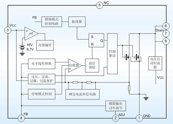 內(nèi)置峰值電流補(bǔ)償電路,可以使不同交流電壓輸入時極限峰值電流一致。還可以通過調(diào)節(jié)端電阻調(diào)節(jié)極限輸出功率。上電時,峰值電流補(bǔ)償最大,然后逐漸達(dá)到平衡,可以減小在上電過程中變壓器的應(yīng)力,防止變壓器飽和。